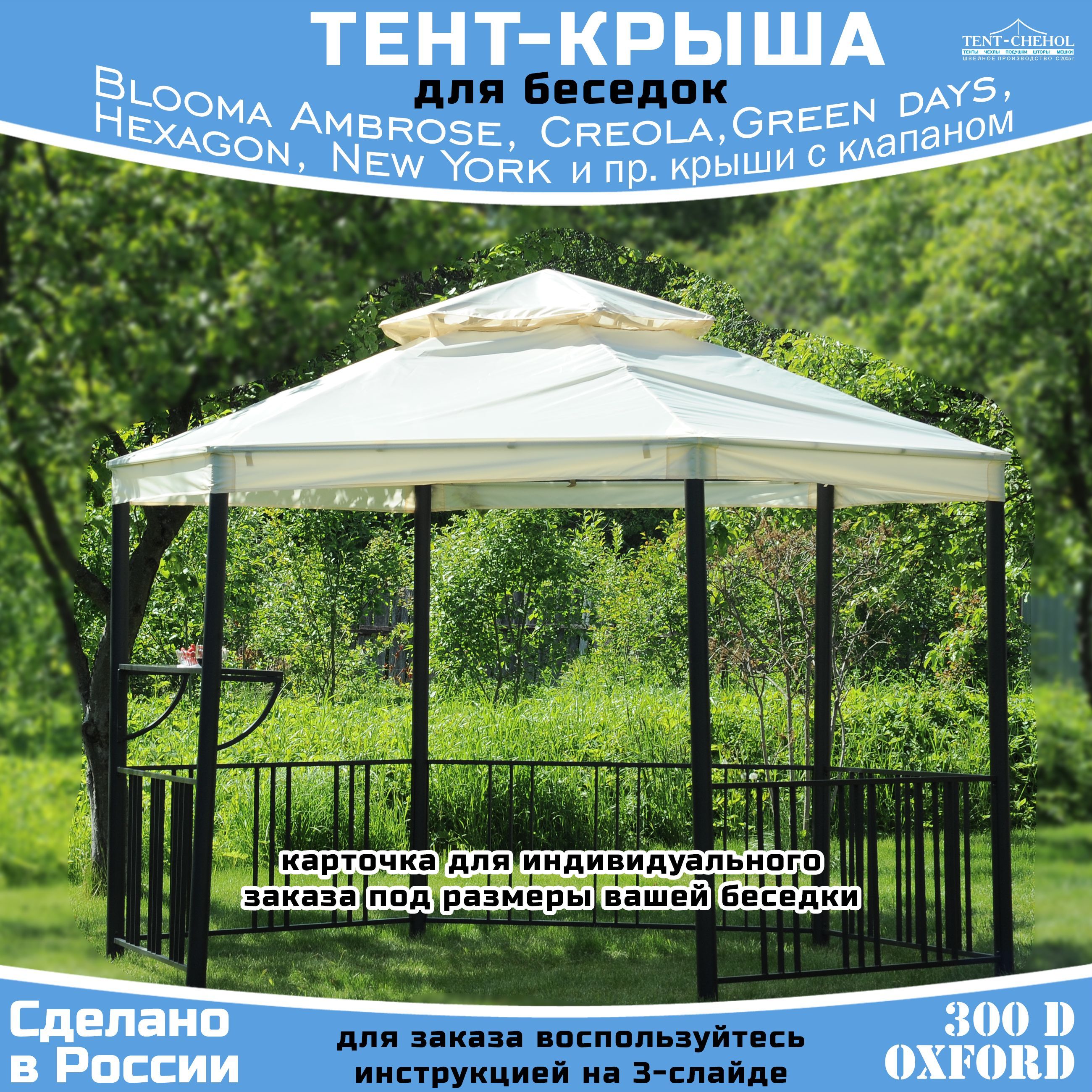Запасной тент предназначен для замены покрытия крыши у шестиугольного павильона (беседки, шатра) Blooma Creola, Ambrose, New York1, Hexagon, Castorama Hexagon Gazebo, Green days и других шестигранных беседок с клапаном на крыше.Тент изготовлен из прочной ткани Оксфорд 300D c водоотталкивающей пропиткой PU1000.